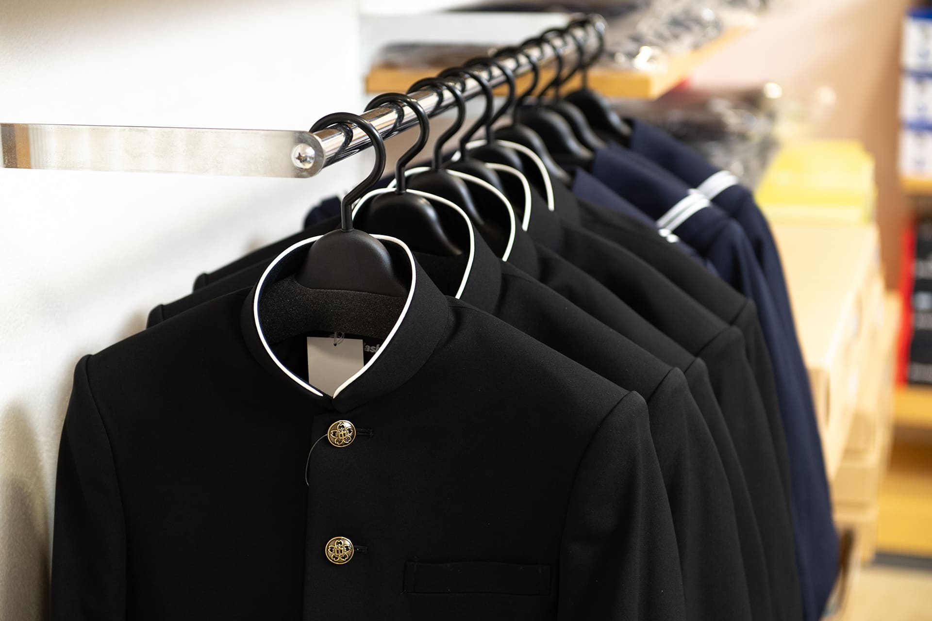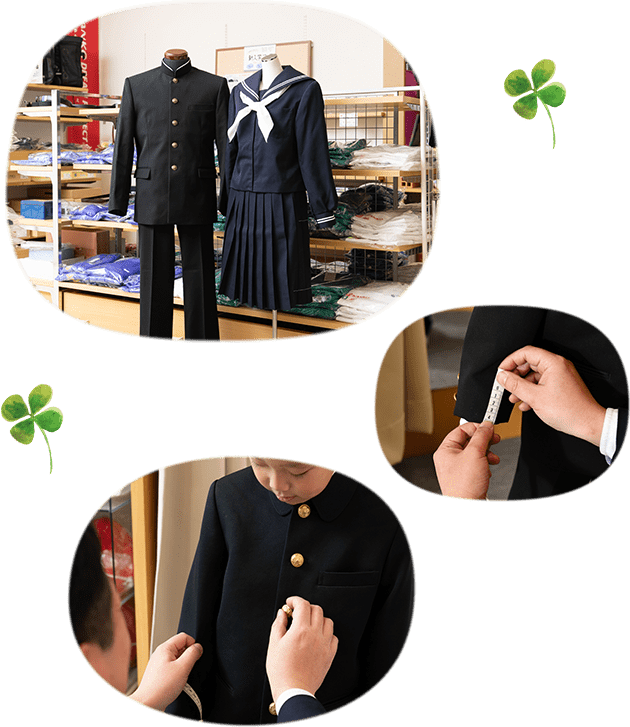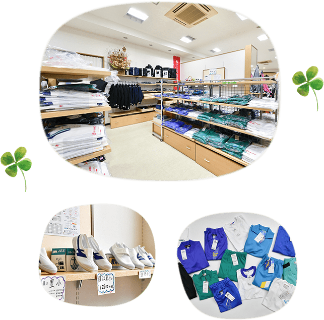 学生上衣、長ズボン(夏用半ズボン)、ポロシャツ(長袖・半袖)、カッターシャツ(長袖・半袖)、セーラー服、スカート(夏スカート)、三角ネクタイ、長袖ブラウス、体操服(トレシャツ・半袖トレシャツ・トレタイツ・クォーターパンツ)、紅白帽子、内ズックなど、入学に必要な一式を当店でそろえていただけます。